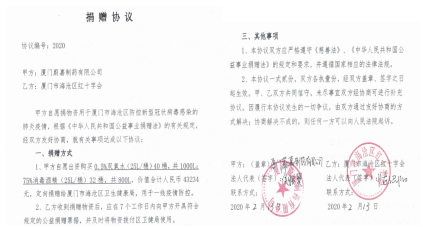 廈門市蔚嘉化學(xué)科技有限公司向海滄醫(yī)院、長(zhǎng)庚醫(yī)院、新陽(yáng)醫(yī)院、海滄街道、嵩嶼街道、新陽(yáng)街道共捐贈(zèng)75%酒精800升,0.5%雙氧水1000升。