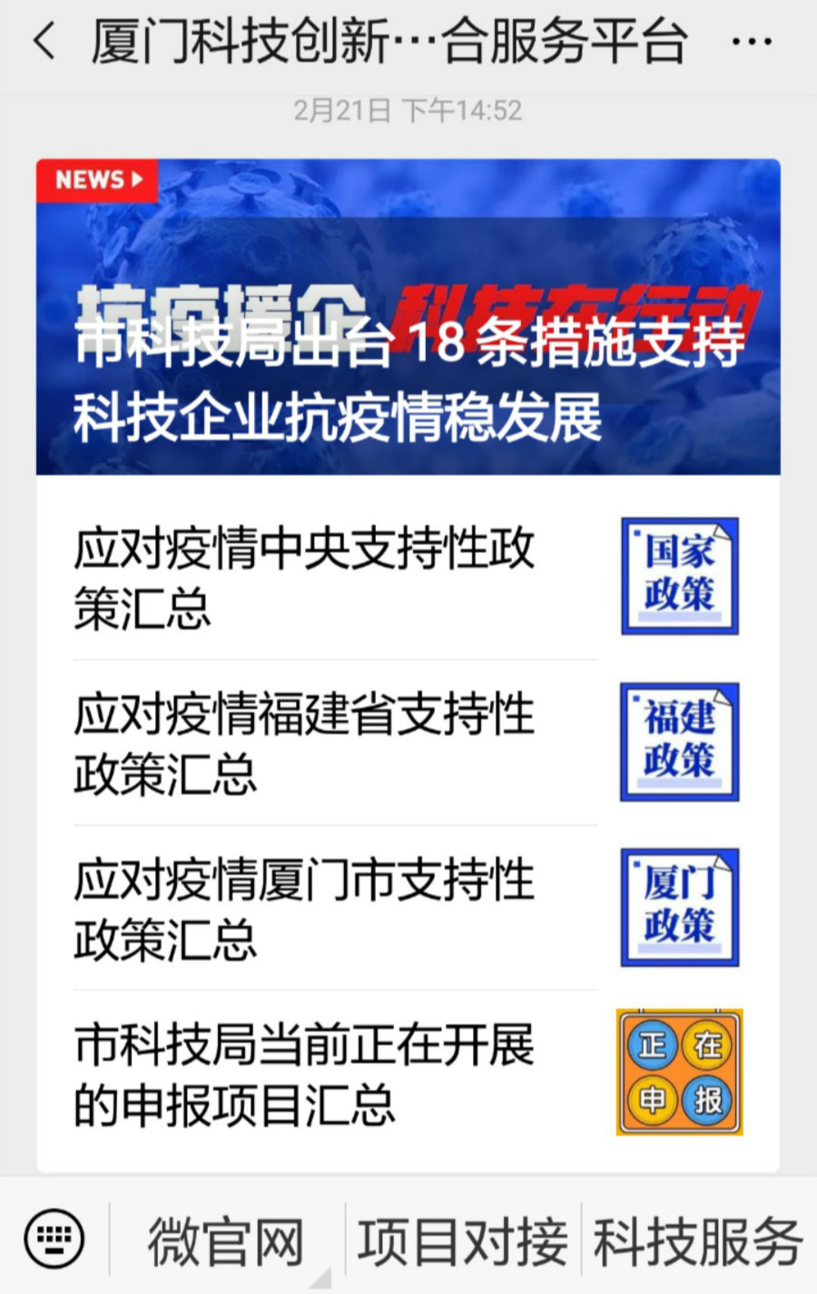 新型冠狀病毒肺炎疫情來勢洶洶,中小微企業(yè)經(jīng)營生產(chǎn)遭受嚴(yán)重影響,國家、省、市密集出臺(tái)了多項(xiàng)抗疫援企的政策舉措,幫助企業(yè)共渡難關(guān)。作為廈門市首家科技服務(wù)“一站式”公共服務(wù)平臺(tái)——廈門科技創(chuàng)新創(chuàng)業(yè)綜合服務(wù)平臺(tái)的運(yùn)營單位,廈門科技交流中心在市科技局、科技集團(tuán)的指導(dǎo)下,體現(xiàn)科技服務(wù)特色,利用微信公眾號(hào)及時(shí)向企業(yè)推送政策信息。一是率先推出科技抗疫18條措施咨詢方式。2月13日,市科技局發(fā)布了《關(guān)于全力支持科技企業(yè)抗疫情穩(wěn)發(fā)展的若干措施》,企業(yè)如何兌現(xiàn)這些幫扶措施,交流中心急企業(yè)所需,主動(dòng)對接市科技局業(yè)務(wù)處室,逐條落實(shí)主管處室和經(jīng)辦人,率先推出18條措施對應(yīng)的業(yè)務(wù)處室及咨詢電話,獲得市科技局肯定和企業(yè)好評。二是及時(shí)推出市科技局申報(bào)項(xiàng)目匯總。疫情期間諸多科技項(xiàng)目申報(bào)延期的情況,為方便企業(yè)及時(shí)了解各項(xiàng)申報(bào)信息,交流中心以申報(bào)截止時(shí)間為序,逐一梳理市科技局目前正在開展的科技項(xiàng)目,推送信息一經(jīng)發(fā)布即獲得大量轉(zhuǎn)發(fā),反響顯著。三是推出應(yīng)對疫情支持性政策匯總。逐一梳理中央、福建省、廈門市應(yīng)對疫情出臺(tái)的各項(xiàng)政策舉措,形成政策原文匯總,方便企業(yè)了解、查詢。下一步,科技交流中心還將依托科技創(chuàng)新創(chuàng)業(yè)綜合服務(wù)平臺(tái),探索網(wǎng)絡(luò)直播政策解讀等方式,服務(wù)企業(yè),服務(wù)創(chuàng)新,服務(wù)發(fā)展。