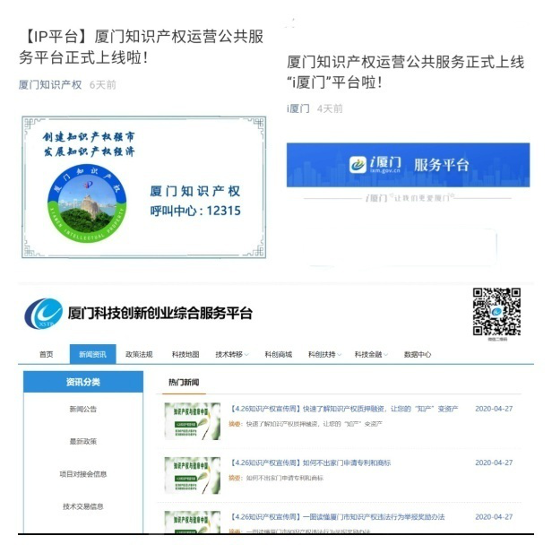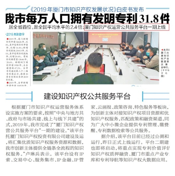 2020年4月20日由廈門市市場監(jiān)督管理局召開新聞發(fā)布會,宣布平臺(一期)正式上線;平臺是根據廈門市知識產權運營服務體系建設實施方案的要求,在廈門市市場監(jiān)督管理局(知識產權局)指導下設立的公共服務平臺。平臺匯集優(yōu)質知識產權服務資源和數據,通過線上平臺和線下園區(qū)服務中心構建便民利民的知識產權公共服務體系,為我市創(chuàng)新主體提供全鏈條全流程的知識產權服務。