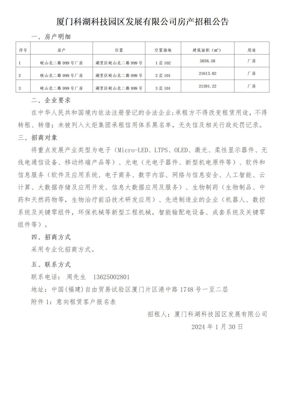 廈門科湖科技園區(qū)發(fā)展有限公司房產(chǎn)招租公告