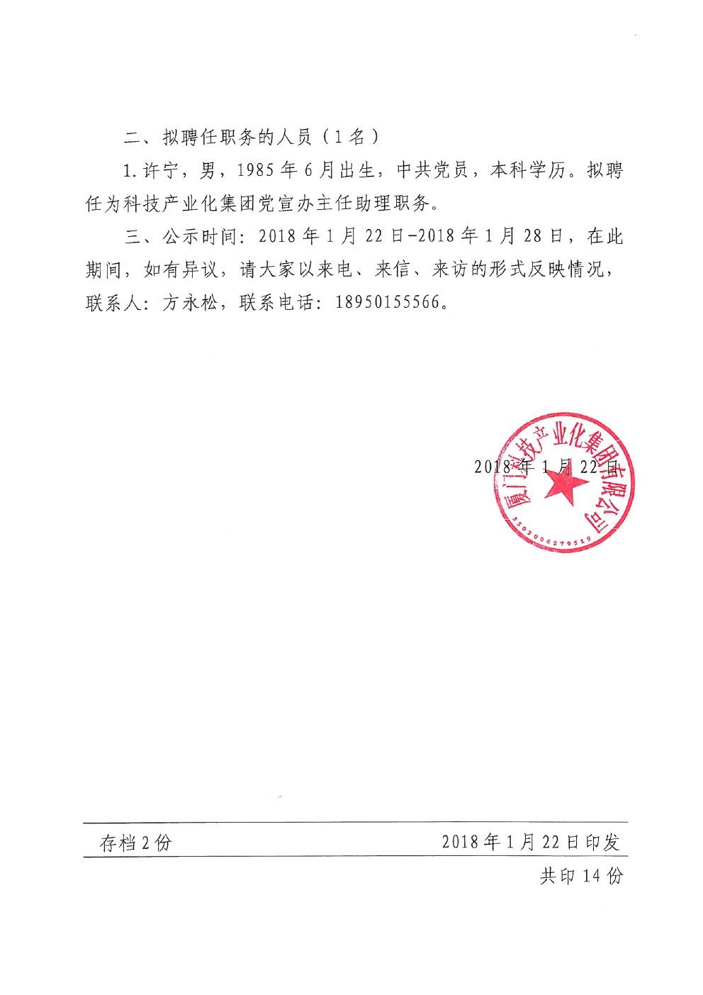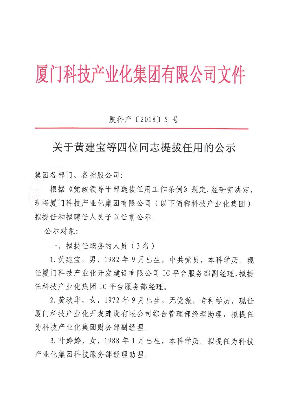 關(guān)于黃建寶等四位同志提拔任用的公示 欄目:通知公告 來源:廈門科技產(chǎn)業(yè)化集團 時間:2018-01-25 熱度:276 關(guān)于黃建寶等四位同志提拔任用的公示.pdf