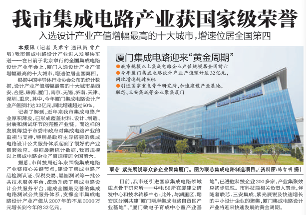 在全國(guó)集成電路設(shè)計(jì)產(chǎn)業(yè)年會(huì)上,廈門入選設(shè)計(jì)產(chǎn)業(yè)增幅最高的十大城市,增速位居全國(guó)第四。