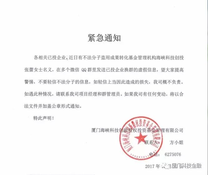 各相關(guān)企業(yè),近日有不法分子盜用科技成果轉(zhuǎn)化基金管理機(jī)構(gòu)海峽科技創(chuàng)投名義,在多個微信 QQ群里發(fā)送已投企業(yè)換群或重要工作安排的虛假信息,望大家提高警惕,不要輕信不法分子而泄露信息,如輕信上當(dāng)因此造成的損失,我司概不負(fù)責(zé)。如遇此種情況,請聯(lián)系我司項目經(jīng)理和群管理員。如我司有任何工作方面的變動,將以合法文件并加蓋公章形式通知。