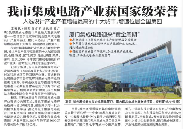 在全國集成電路設計產業(yè)年會上,廈門入選設計產業(yè)增幅最高的十大城市,增速位居全國第四。